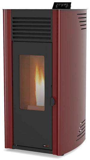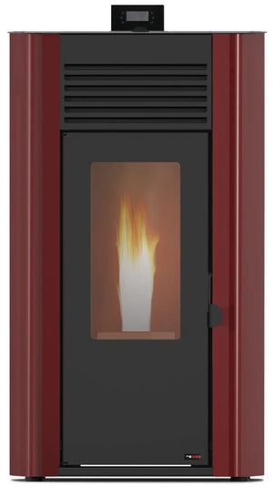 Salamandra a pellets hidro de 13KW REDPOD de aço em cor bordeaux. Com rendimento é de 96,4%, possui um tubo de evacuação de fumos na parte traseira com 80 mm de diâmetro. Superfície recomendada é até 130 m², permite aquecer mais do que uma divisão da casa. Medidas: 110 x 60 x 65 cm (altura x largura x profundidade).
